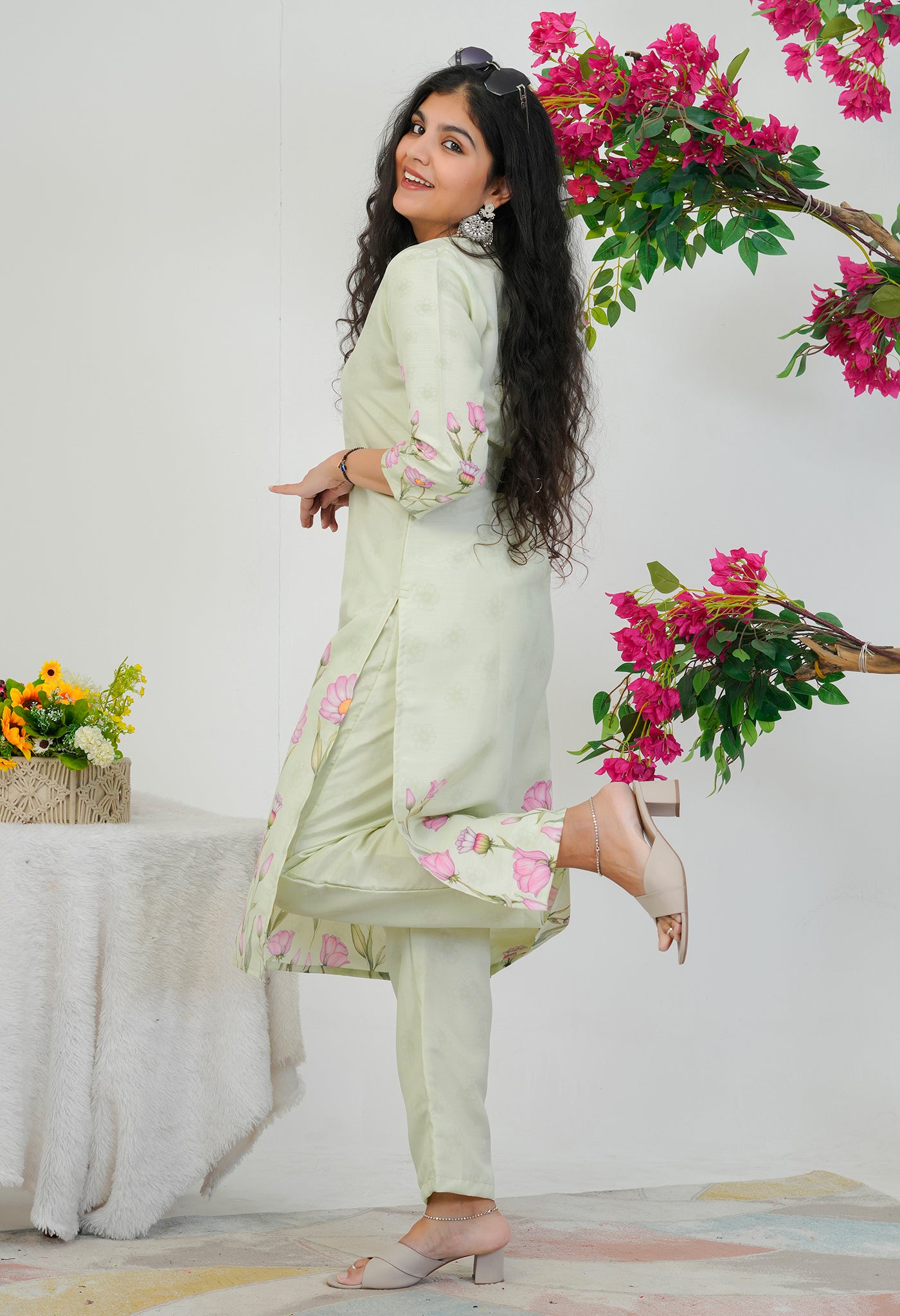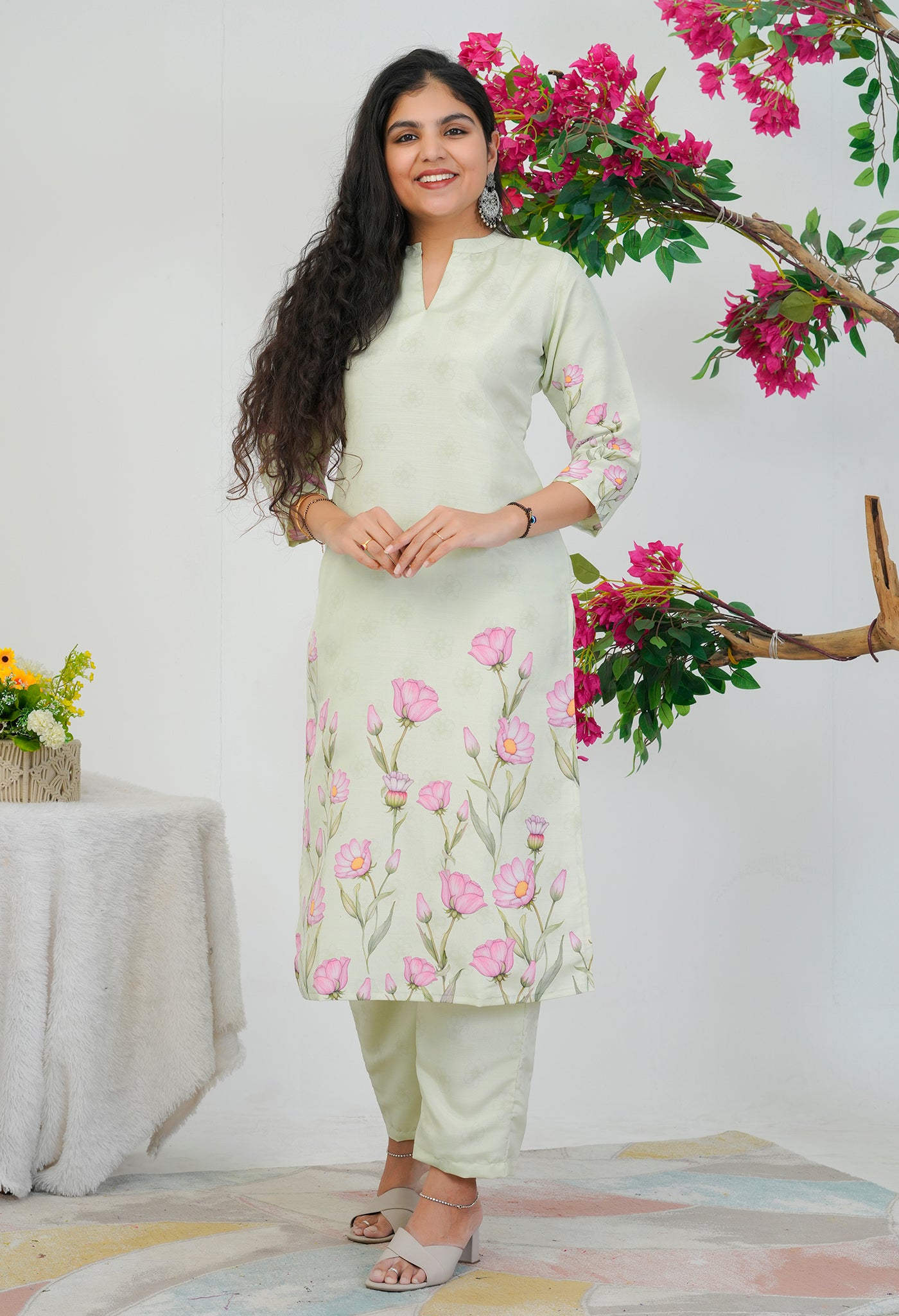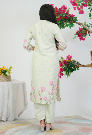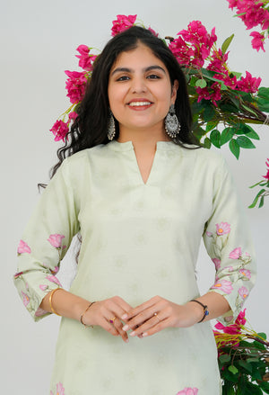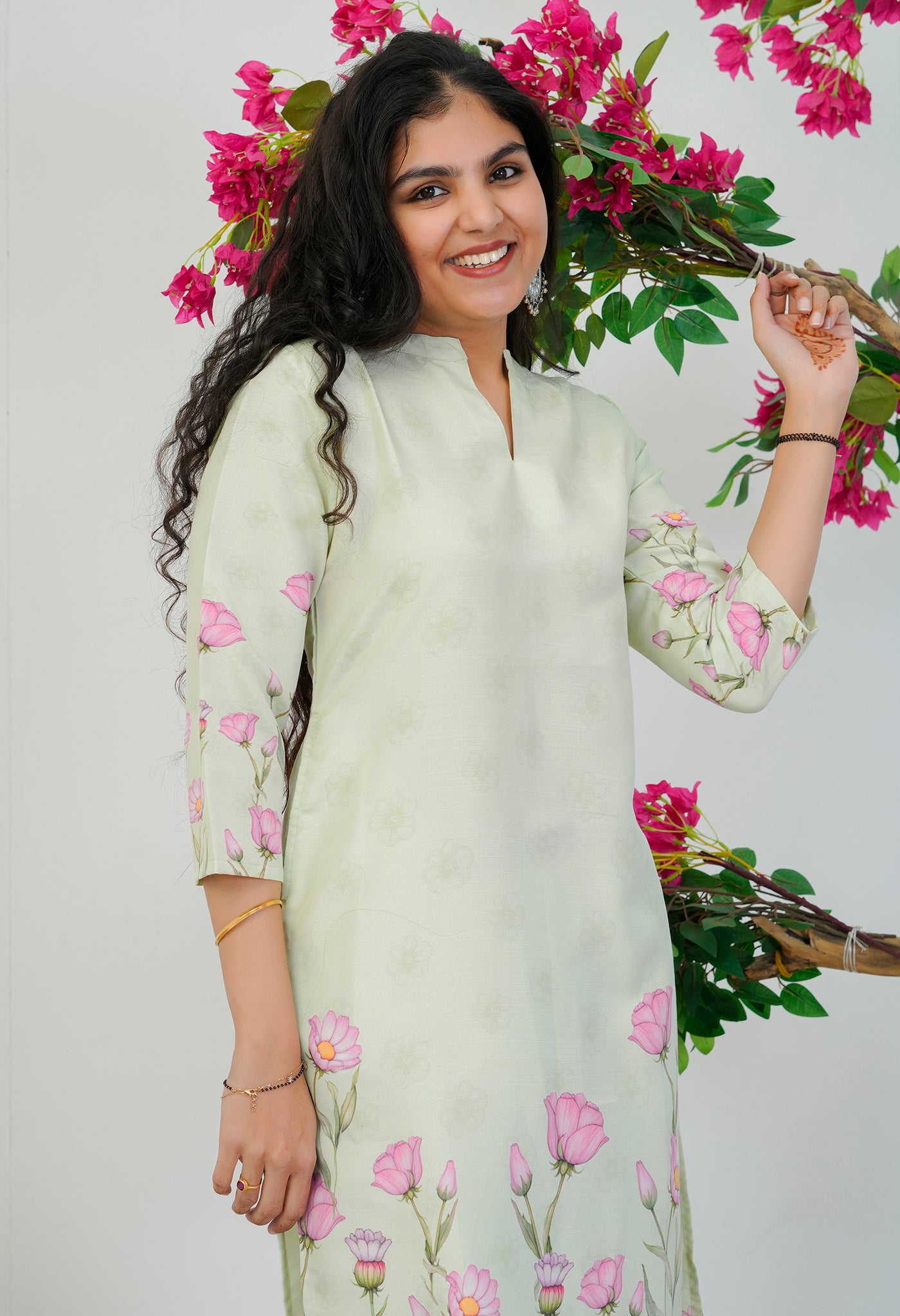 Pista Green Shimmer Slub Cotton Floral Print Kurta Palazzo Set