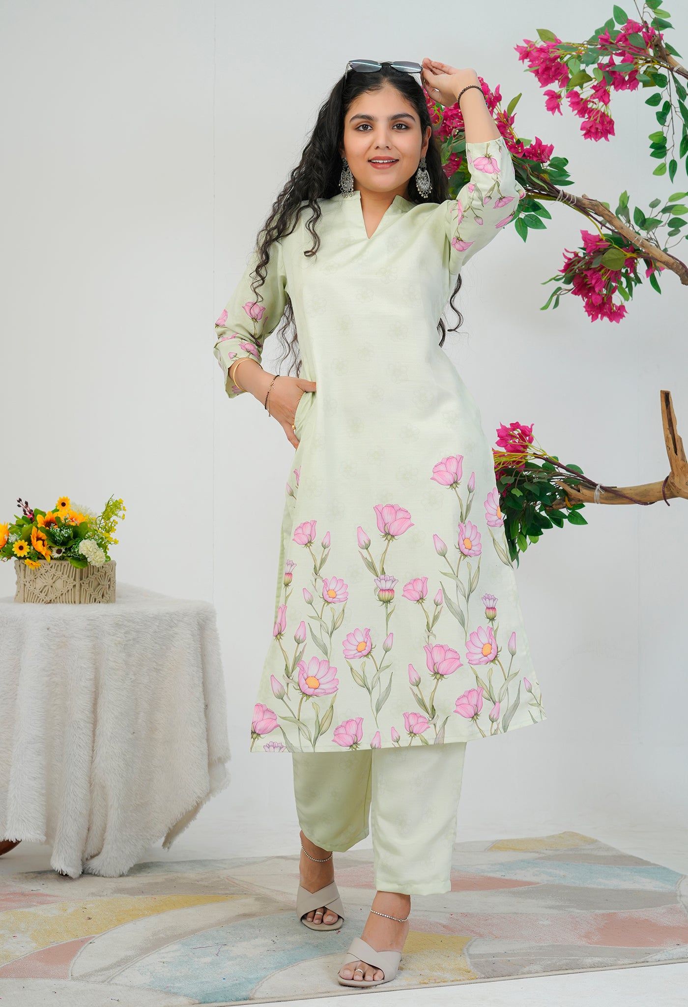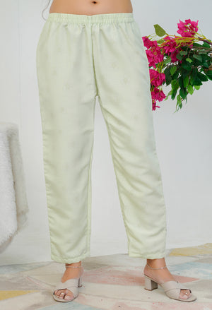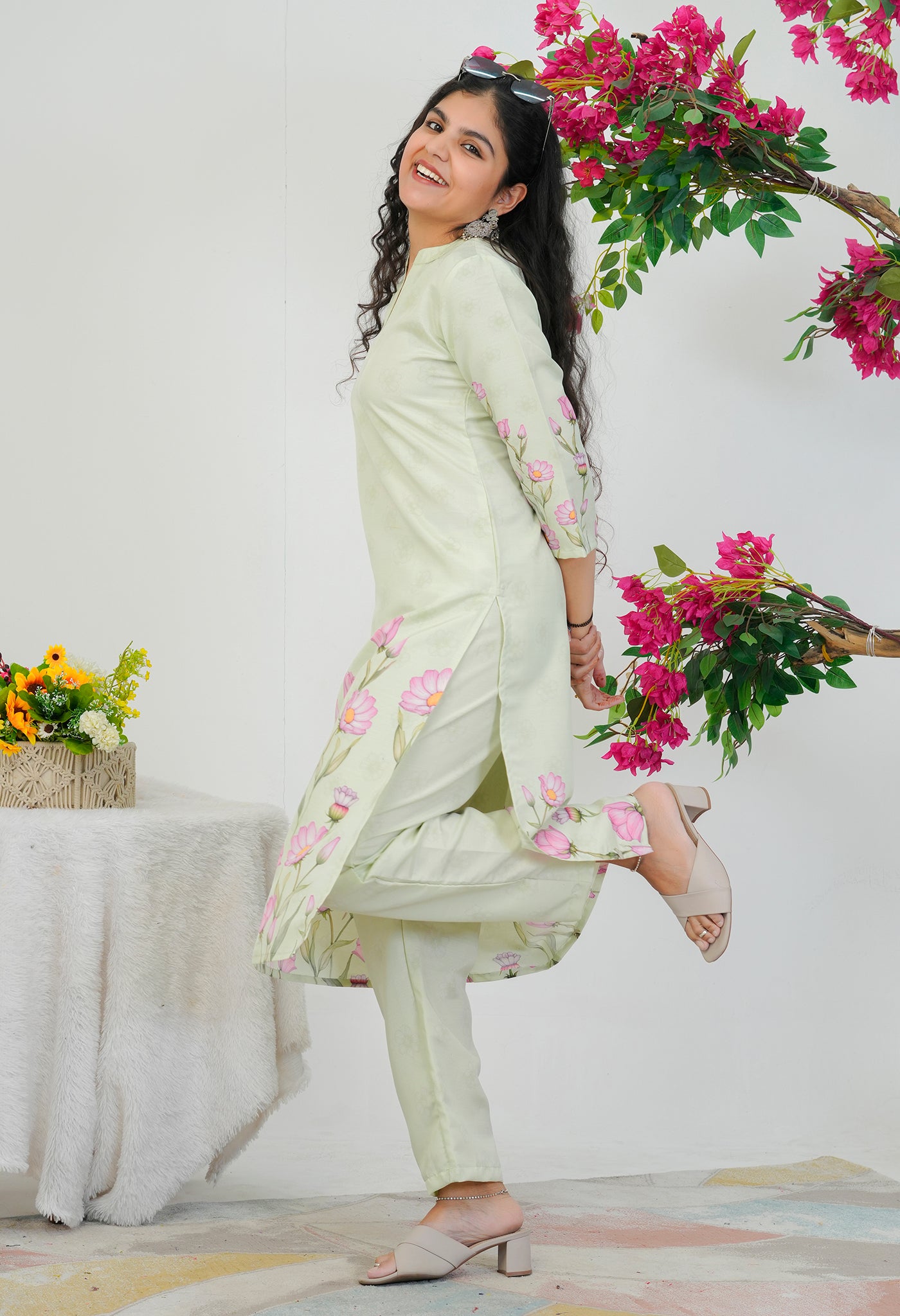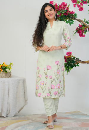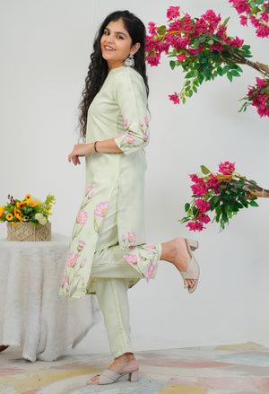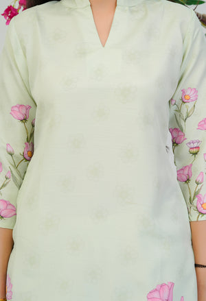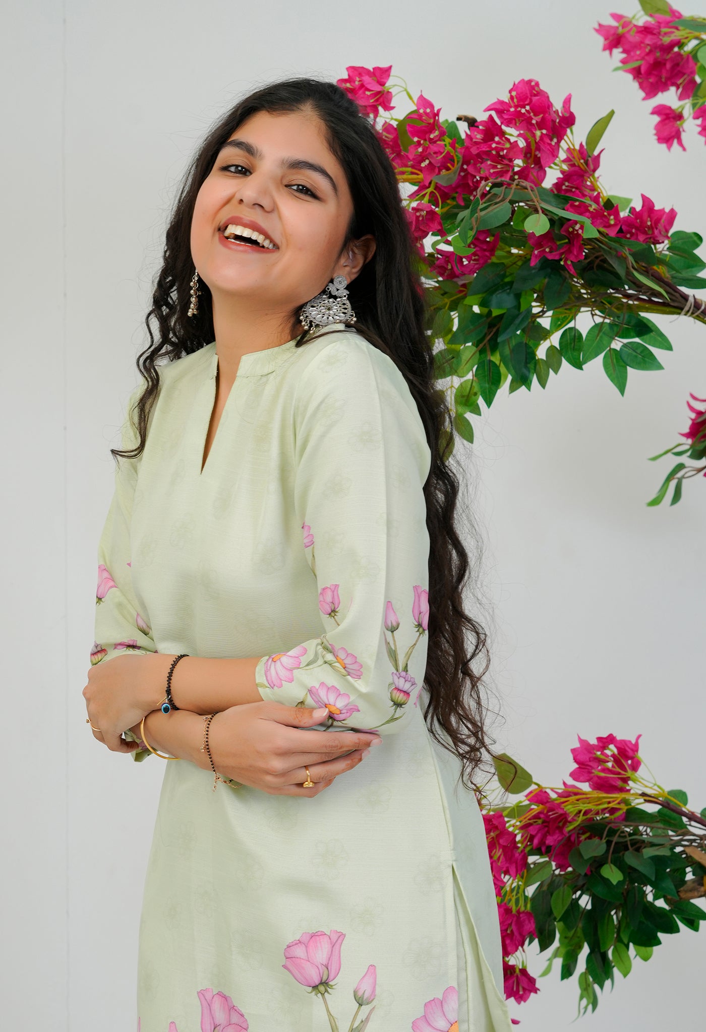 Pista Green Shimmer Slub Cotton Floral Print Kurta Palazzo Set